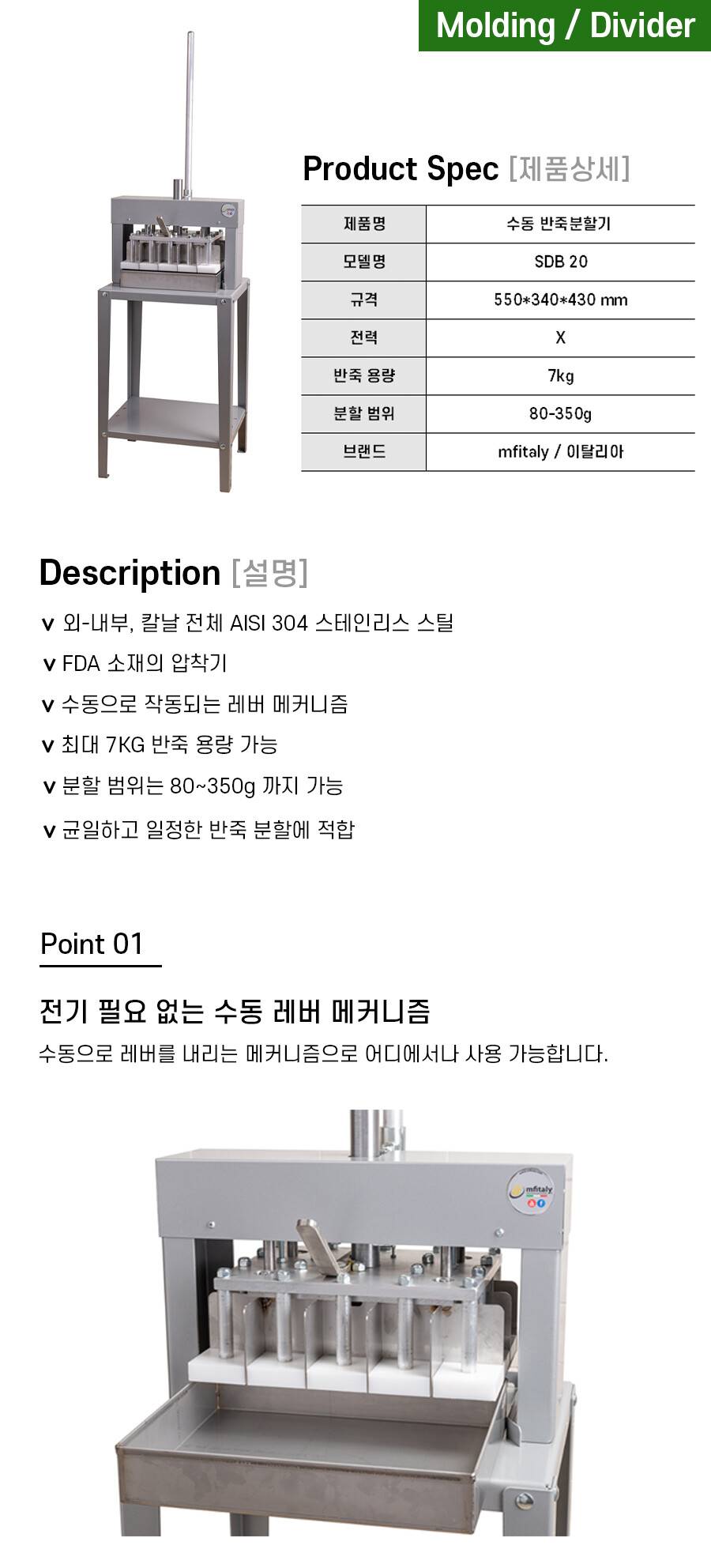 V 반죽 최대 7KG 용량이 가능하며 분할 범위는 80~350g 까지 가능합니다.