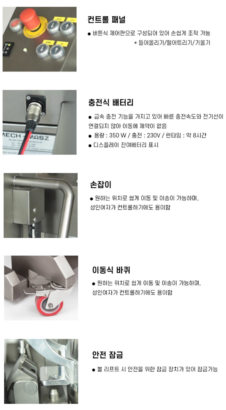 v 컨트롤 패널이 버튼식으로 구성되어 있어 손 쉽게 조작 가능 (들어올리기/떨어트리기/기울기)