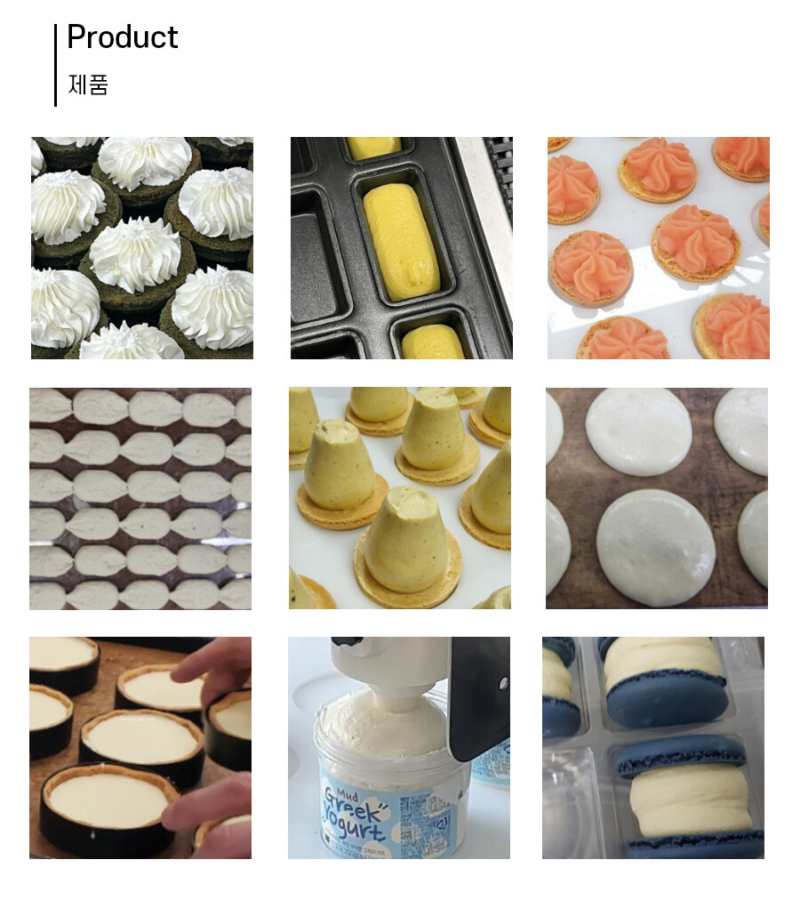 V 크림, 슈, 마카롱꼬끄, 필링, 치즈, 그릭요거트, 생크림 등 다양한 제품군으로 사용가능합니다.