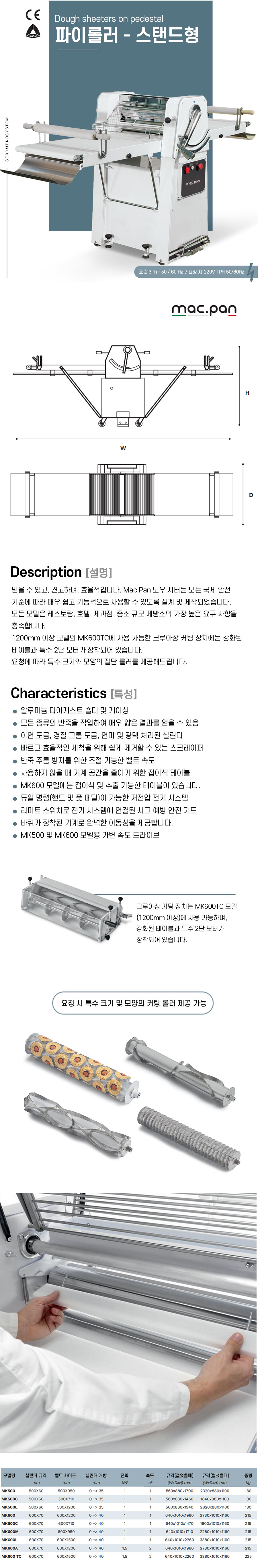V 1200mm 이상의 모델의 MK600TC 에 사용 가능한 크루아상 커팅 장치에는 강화된 테이블과 특수 2단 모터가 장착되어 있습니다.