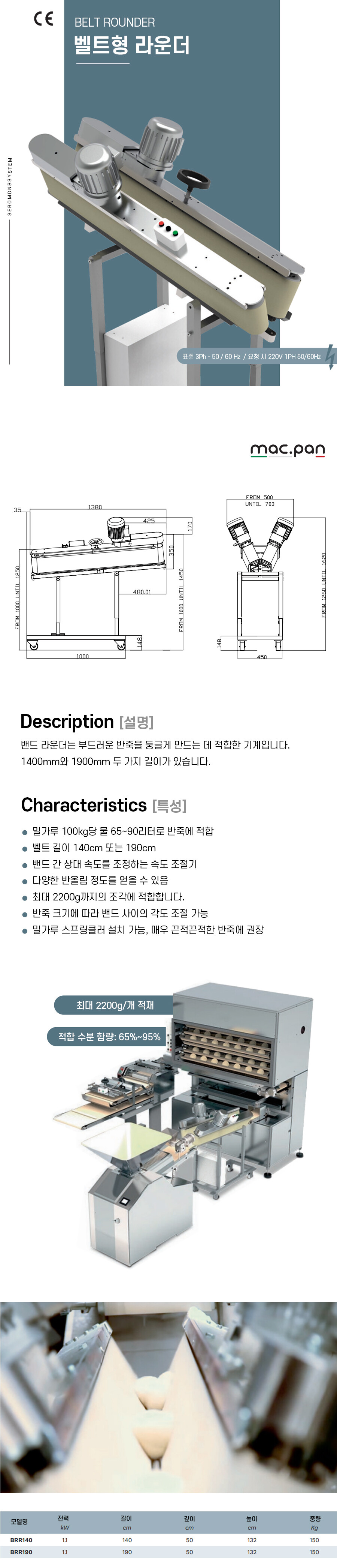 V 반죽을 둥글게 만드는 데 적합한 기계입니다. 1400mm 와 1900mm 두가지 길이가 있습니다.