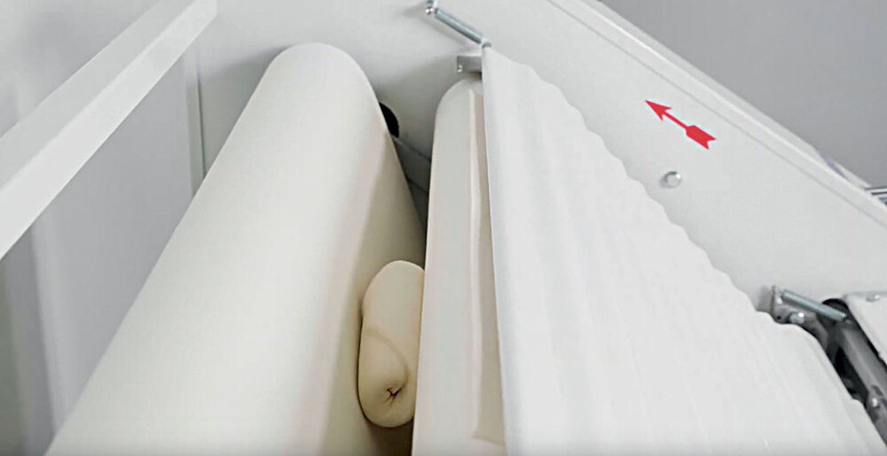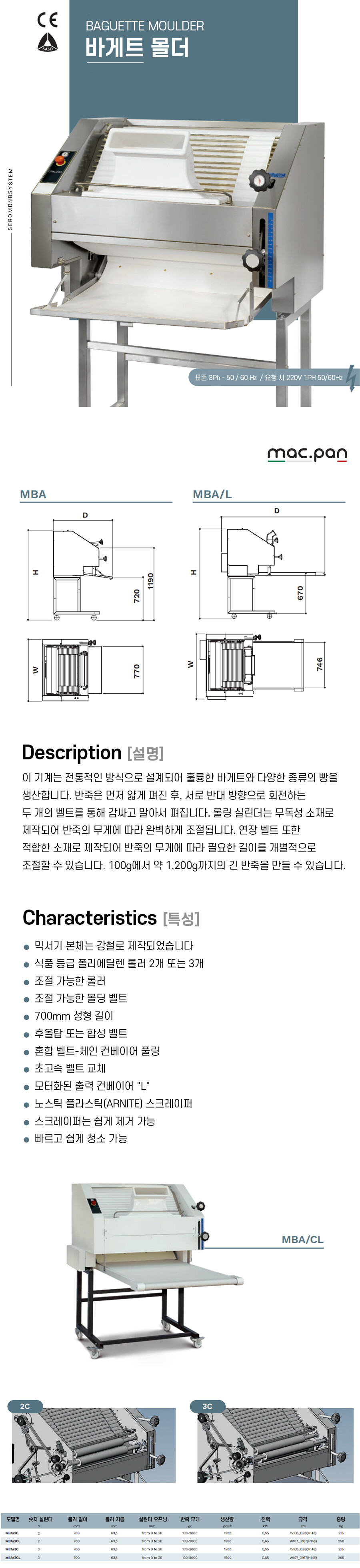 V 반죽을 먼저 얇게 편 후 서로 반대 방향으로 회전하는 두 개의 벨트를 통해 감사고 말아서 펴지는 메커니즘으로 바게트 성형에 적합합니다.